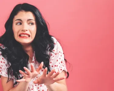 A woman makes a grossed-out facial expression in response to something she's seeing.